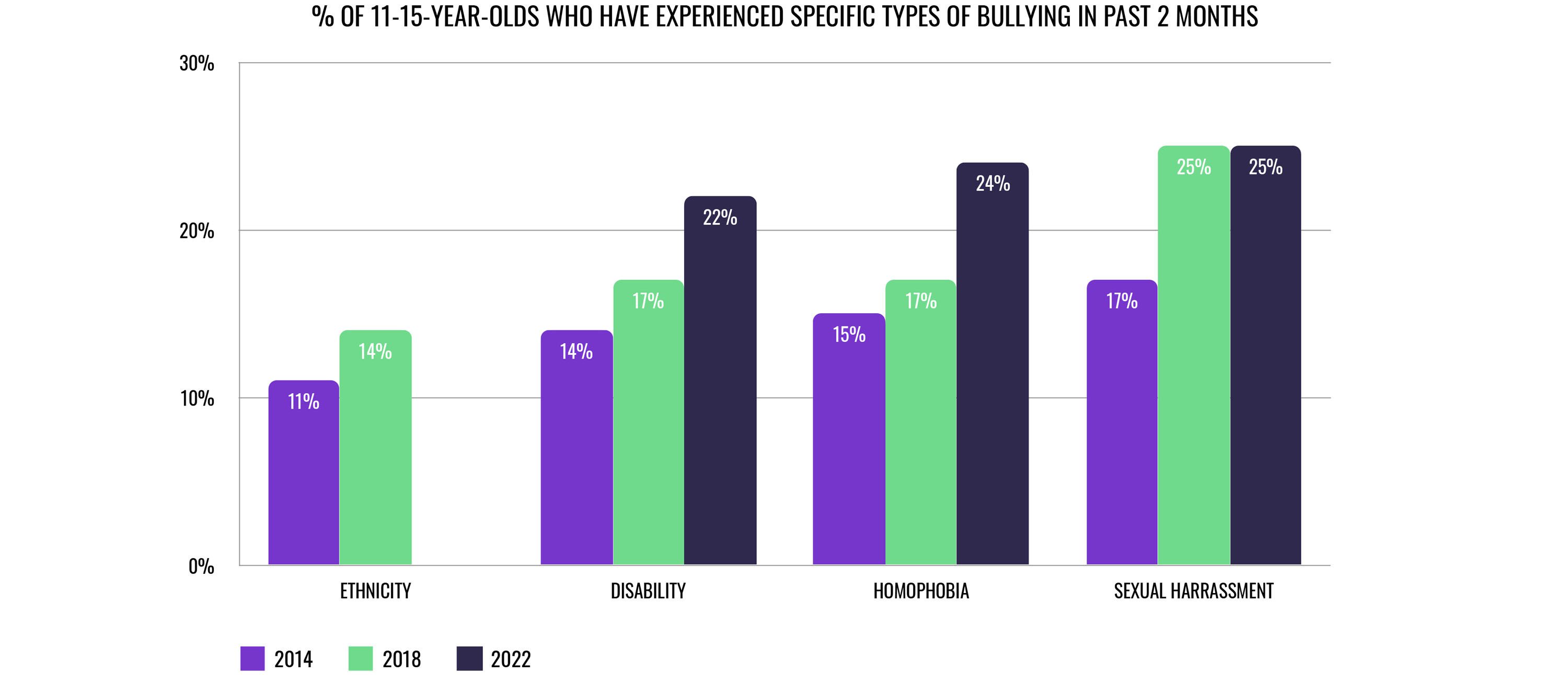 Perhaps what's most striking in this chart though, is the rise in sexual harassment. It may be that young people’s awareness of sexual harassment increased as a result of the #MeToo movement gaining momentum in 2017 after the Harvey Weinstein. Sadly things still aren't looking great on that front. A 2021 Ofsted Rapid Review found that harmful sexual behaviours are happening so frequently that some young people think it's just normal. Even though schools are saying, "Speak out about it!" many young people are scared to do so, fearing they won't be believed or might get blamed. It's a real struggle, and it shows we've got some work to do in making our schools safer and more supportive places.2