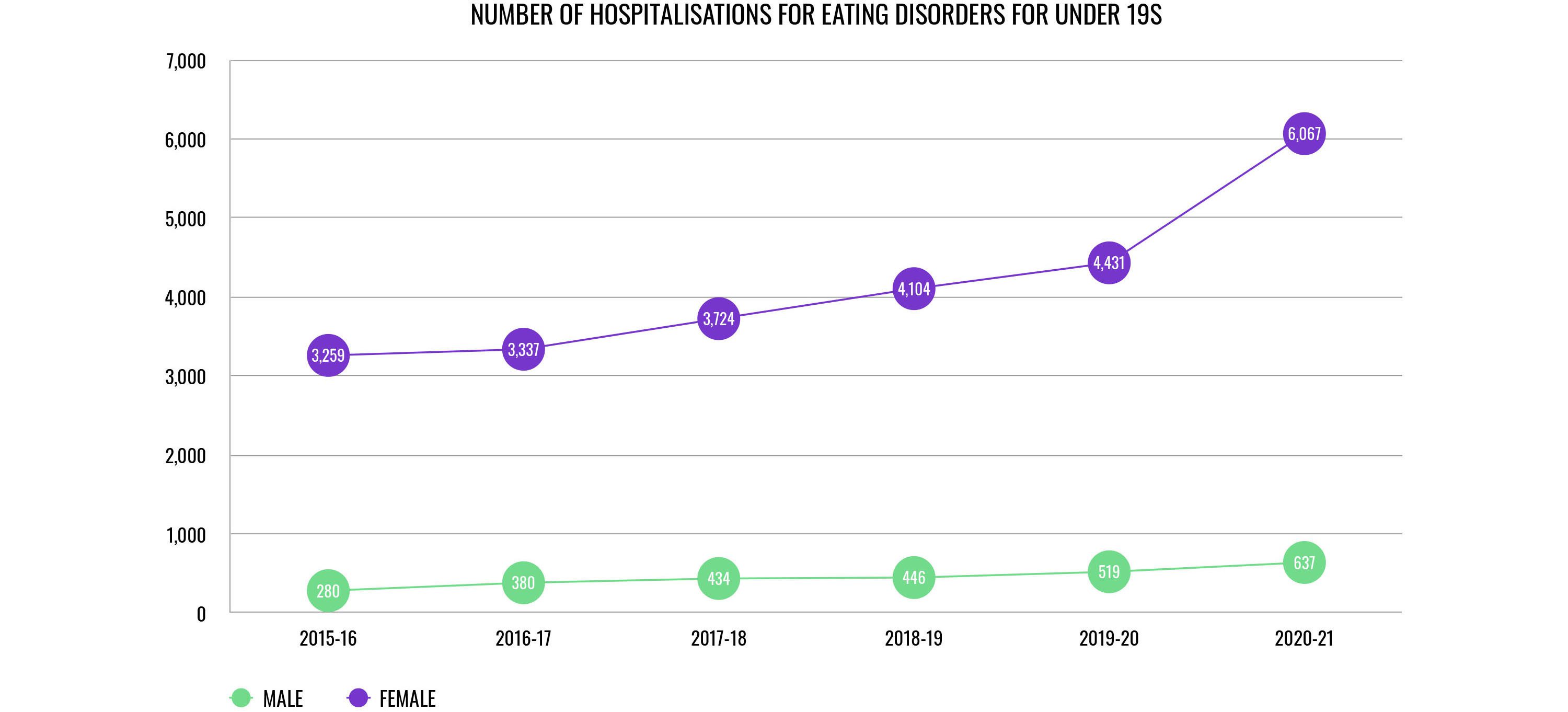 Over a span of just five years, there has been a staggering 89% increase in the admissions of young people to hospitals due to eating disorders. And what’s most stark is the rapid escalation in the last year alone, up by 35%. It looks likely that the COVID-19 pandemic exacerbated an already troubling trend. While the majority of these admissions are females, there is a clear rise in admissions of boys and young men. They’ve more than doubled in five years, up by 128%