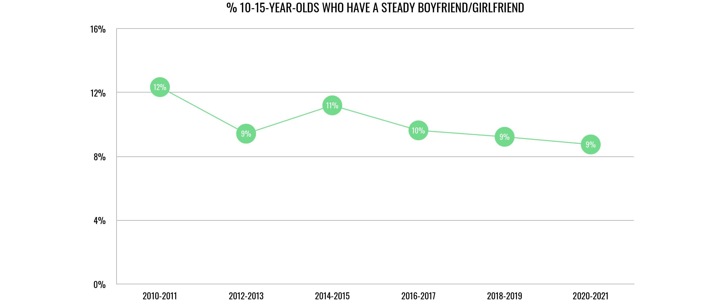 Let's talk about teenage romances for a minute, because the numbers are telling an interesting story. In 2010/11, 12% of 10-15-year-olds said they had a steady girlfriend or boyfriend, and that dropped to 9% in 2020/21.