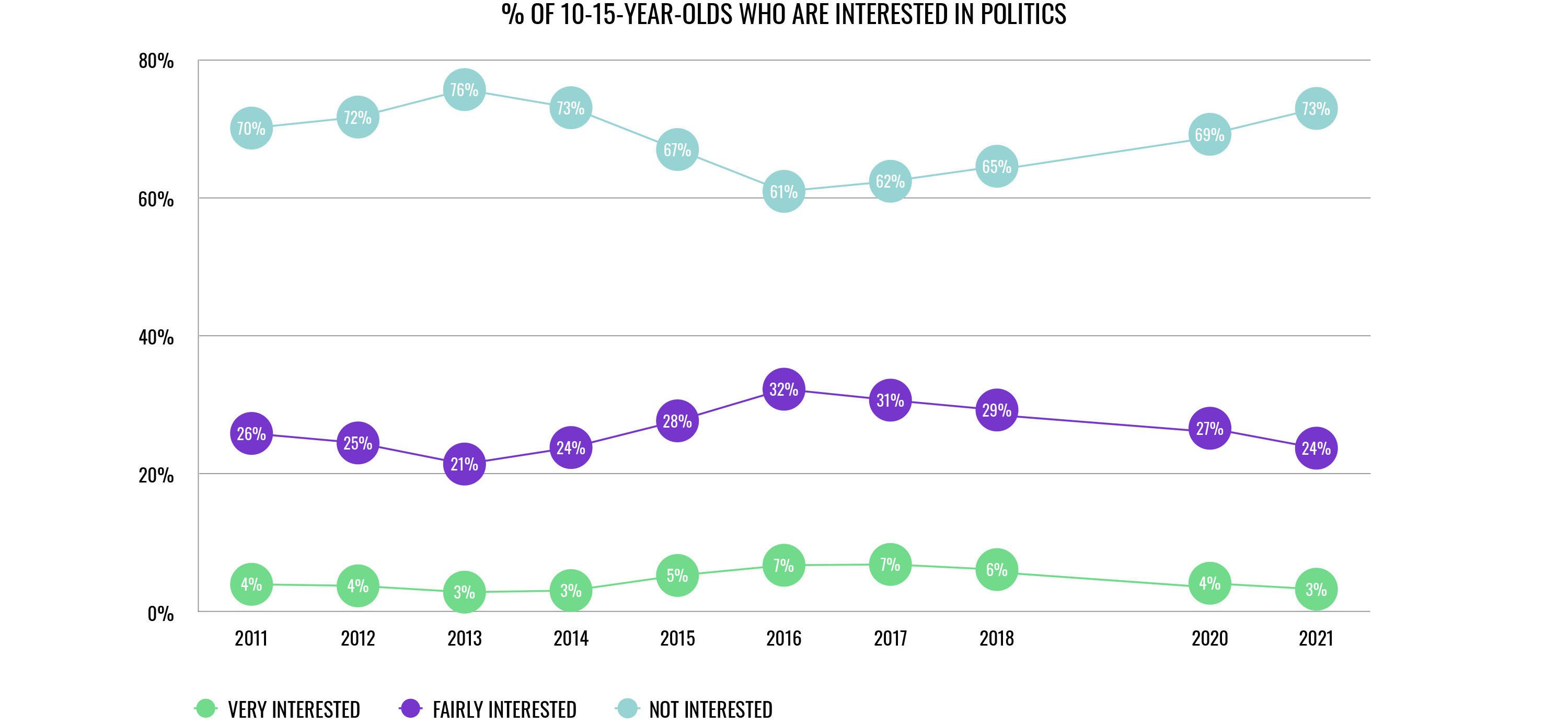 It's something of a mixed bag when it comes to young people and politics, with their interest in politics going up and down. There were some peaks between 2013 and 2016 that happened to coincide with the rise of UKIP and the Brexit referendum. It was an unpredictable time in British politics, and it got a lot of young people paying attention. But since then their interest has waned – and the pandemic apparently did little to change that.