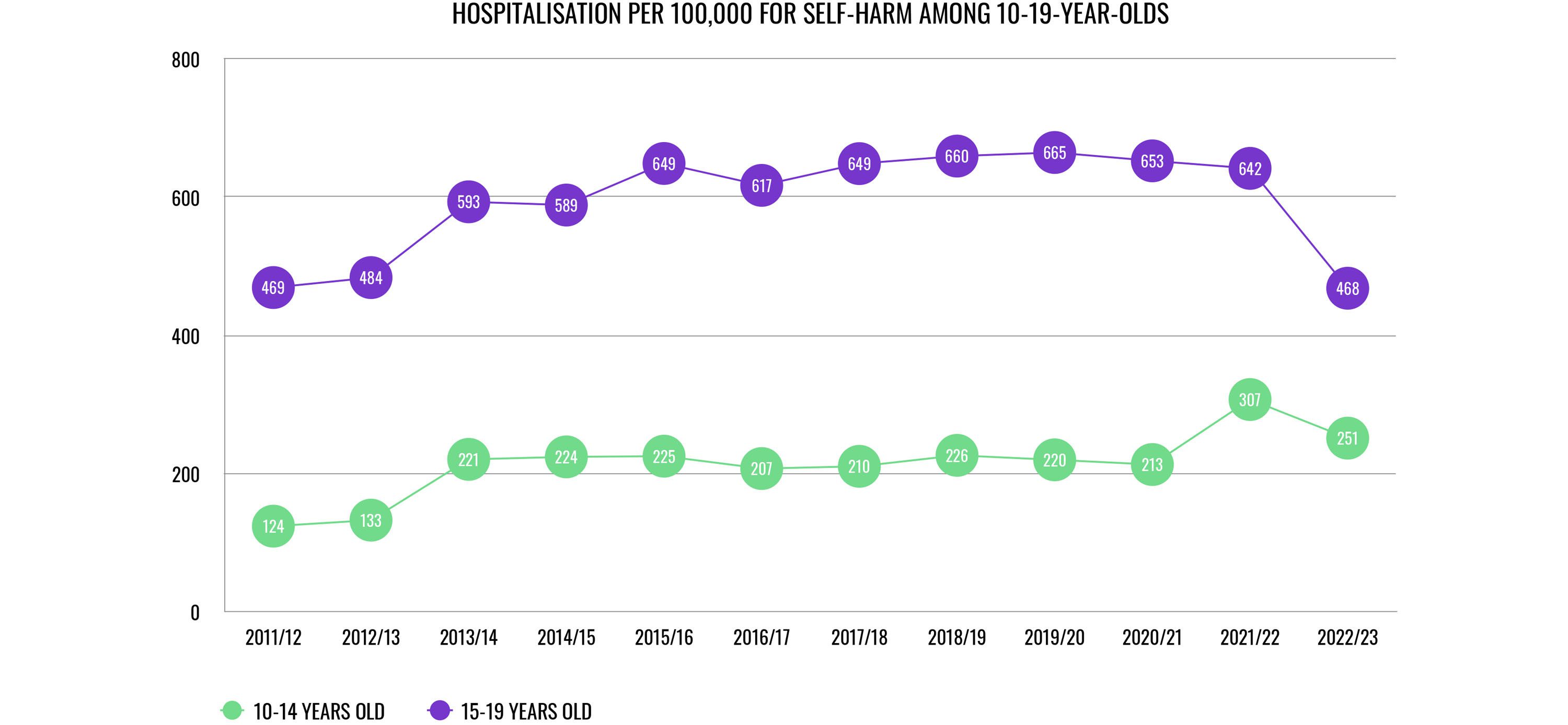 We’ve seen a sharp spike in hospitalisations between 2011/12-2021/22 amongst 10–14 year olds, with admission rates more than doubling, from 124 to 307 per 100,000. In the same time period there has also been a 37% increase in self-harm related hospitalisation for 15–19-year-olds.