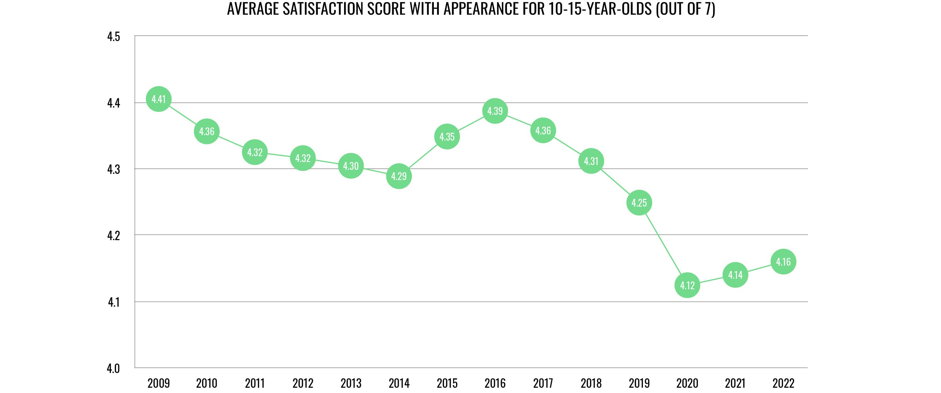 When they're asked about different aspects of their lives, like family, friends, school, and schoolwork, appearance is the one that gets the biggest thumbs-down. About 1 in 7 young people are saying they're not too happy with how they look, and that's a jump from 1 in 10 in 2010 (the year Instagram was first released).