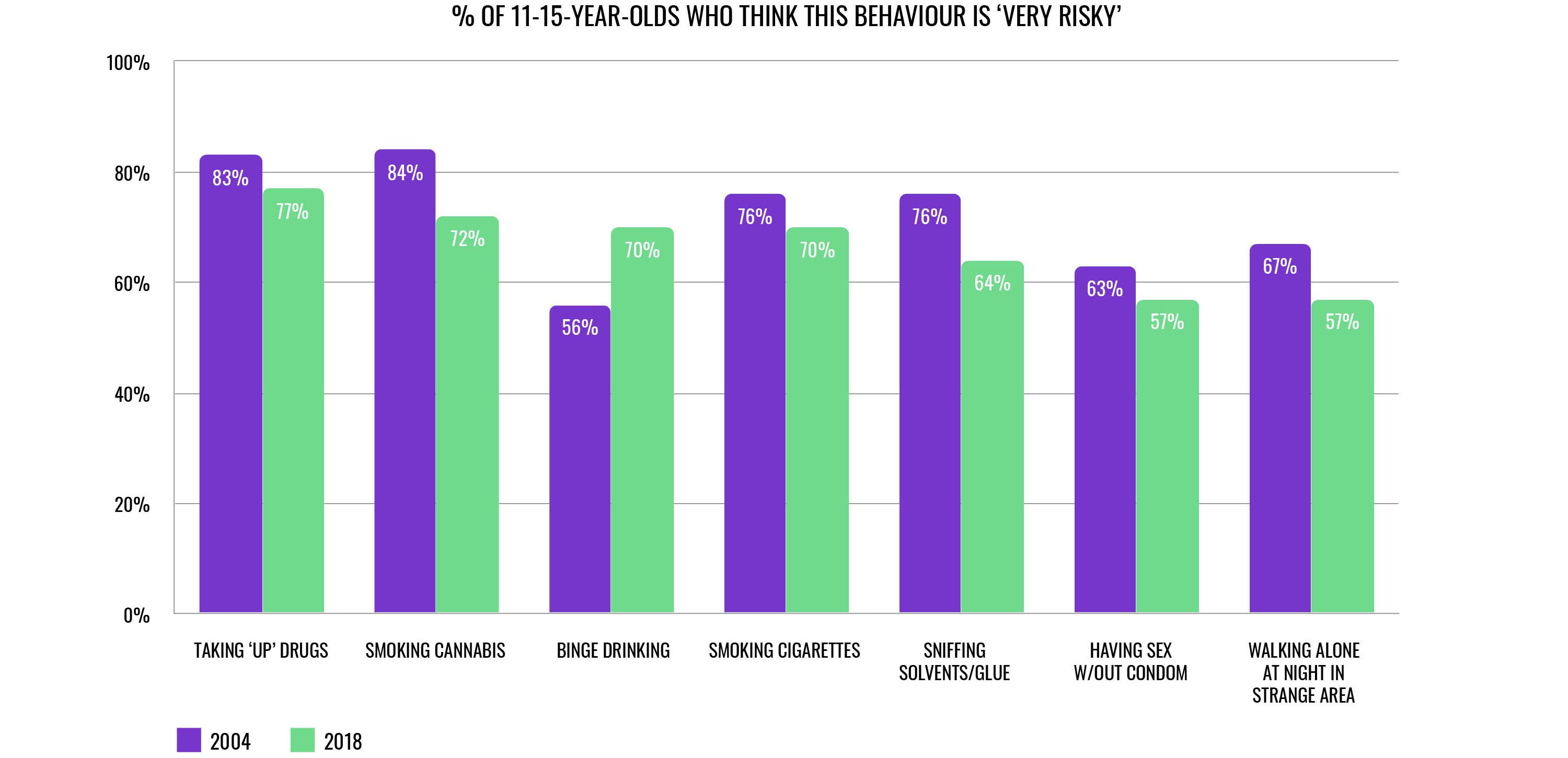 We’ve seen that fewer young people are participating in risky behaviours like drug use, smoking and drinking alcohol (Chart 4 in this section), but there’s also been a shift in their perception of risk. Compared with teenagers in 2004, today’s young people are less likely to see drug use, smoking, unprotected sex and walking alone at night as ‘risky’.