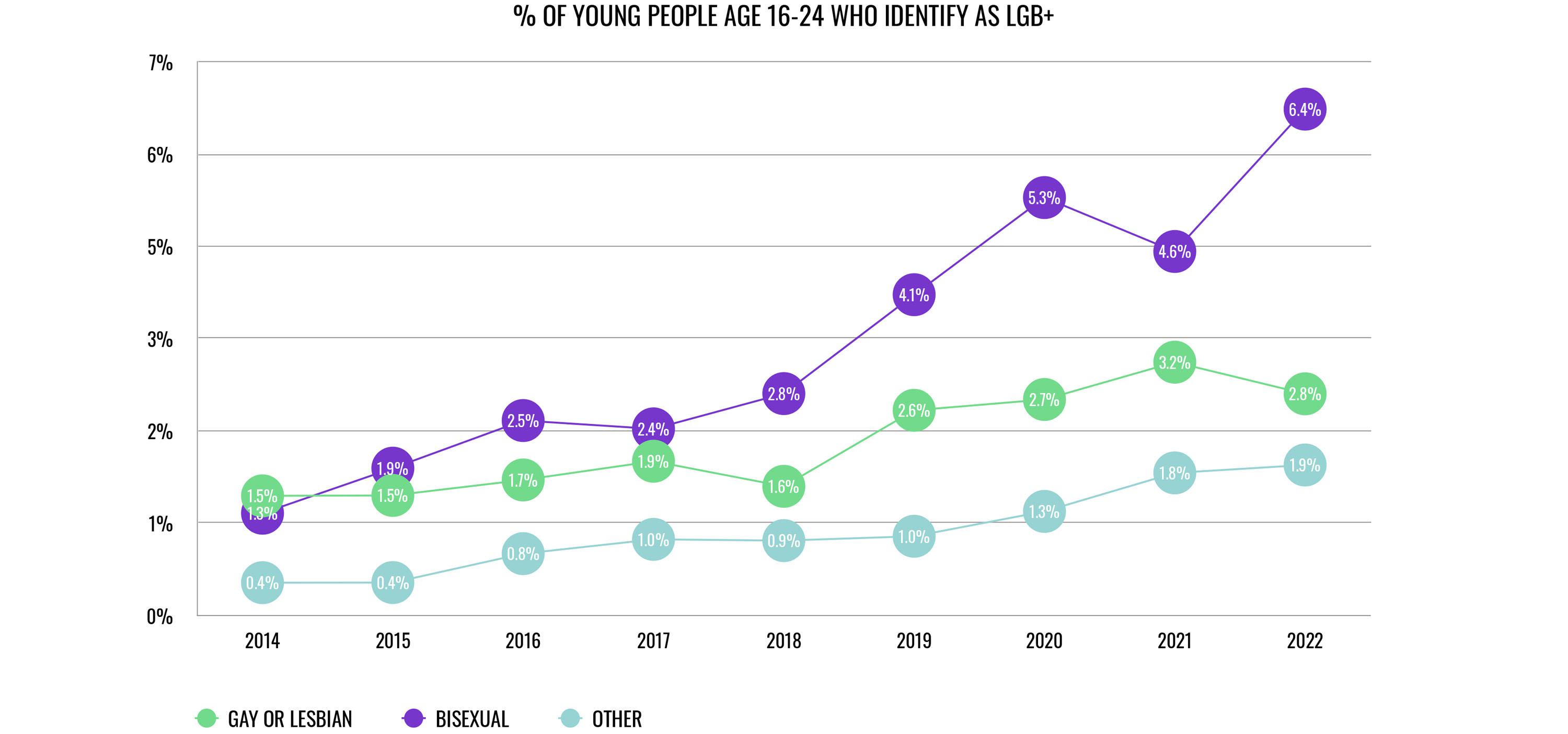 It's clear things are changing when it comes to how young people perceive their sexual orientation. In the 2021 census, there was a notable increase in the number of 16-24 year olds identifying as Lesbian, Gay, or Bisexual (LGB+) and this group were more likely to identify as LGB+ than any other age group. The primary contributor to this shift is the rising number of young people identifying as bisexual, which grew from 1.3% in 2014 to 6.4% in 2022.