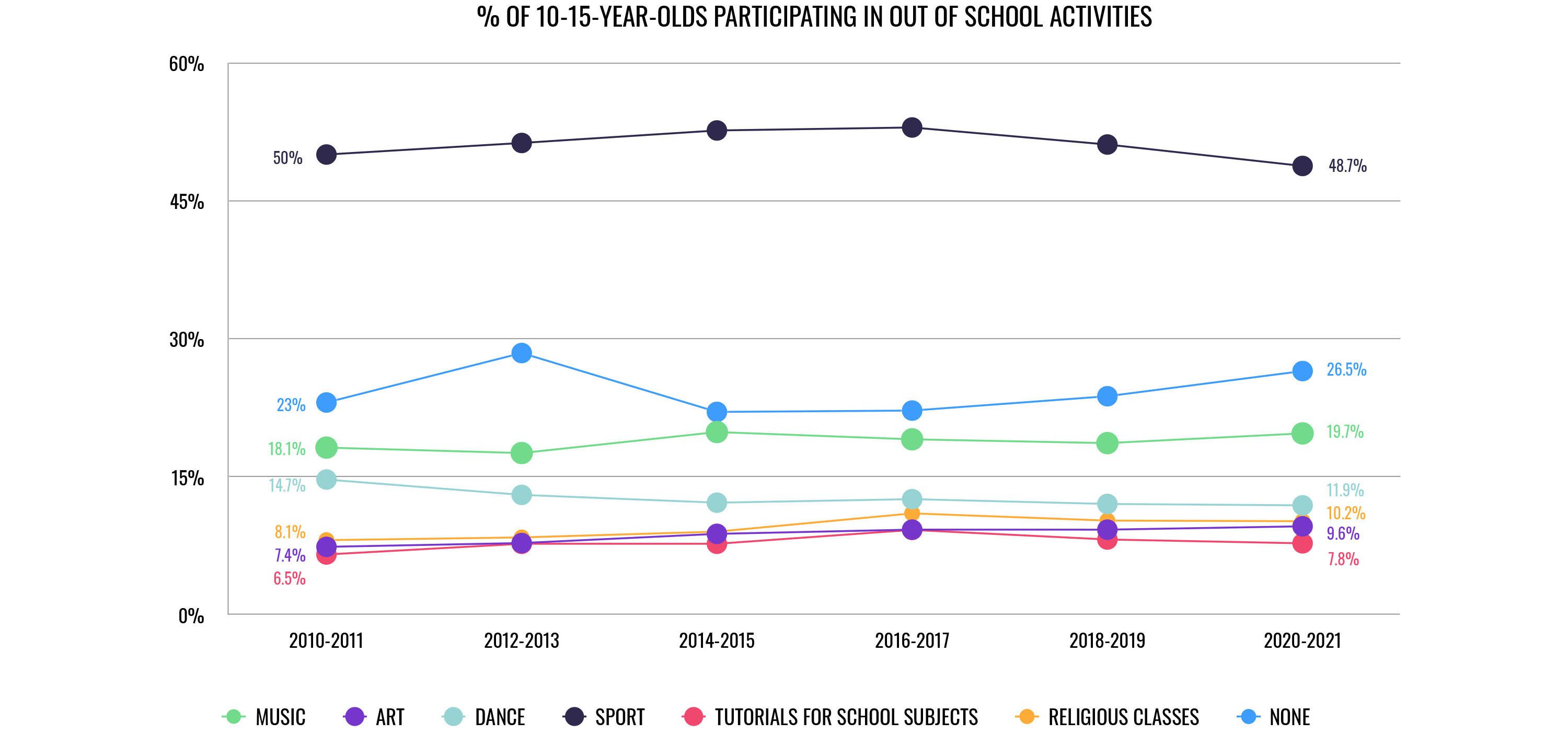 Just under three quarters of 10-15 year olds take part in some kind of out-of-school activities, and sport clubs are the reigning champions. There’s been high and fairly steady participation across the last ten years, though recent years saw a little drop in numbers. There’s also been a slight decline in the percentage of young people taking part in dance classes (from 14.7% to 11.9%). On the flip side, there are equally slight increases in the number of younger teenagers engaging with music, art, and religious classes. Less physical activity and more creativity?